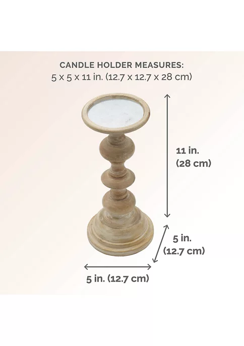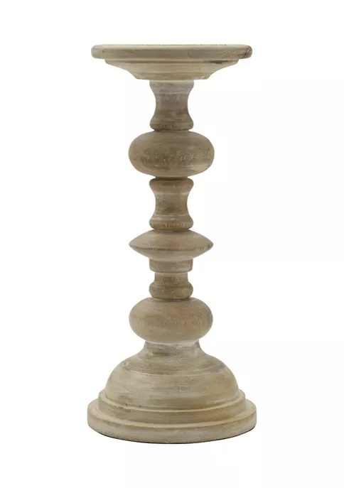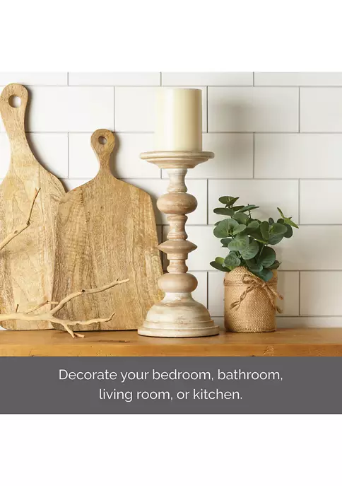 Add the warmth of ambient candlelight to your décor with this 11″ White Wash Candle Holder. Stunningly crafted of mango wood with a natural wood color and white wash finish to give it an antiqued appearance, this lovely candle holder has a classic, curvy silhouette. When used with a lit candle, it brings an elegant ambiance to your dining table, but it can also be displayed on its own as a striking decorative piece. Holds one real wax or LED pillar candle, not included.