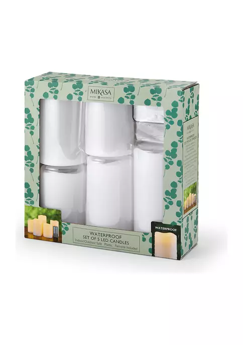 Elegant waterproof candle perfect for outdoor entertaining. Waterproof plastic finish with waterproof battery compartment. Convenient 10 Keys Remote features 2 4 5 8 hour timer functions. Operates on 2 AA batteries not included. Made of plastic with LED components. Pillars measure 2-3×4, 2-3×5, 1-3×6 inches.