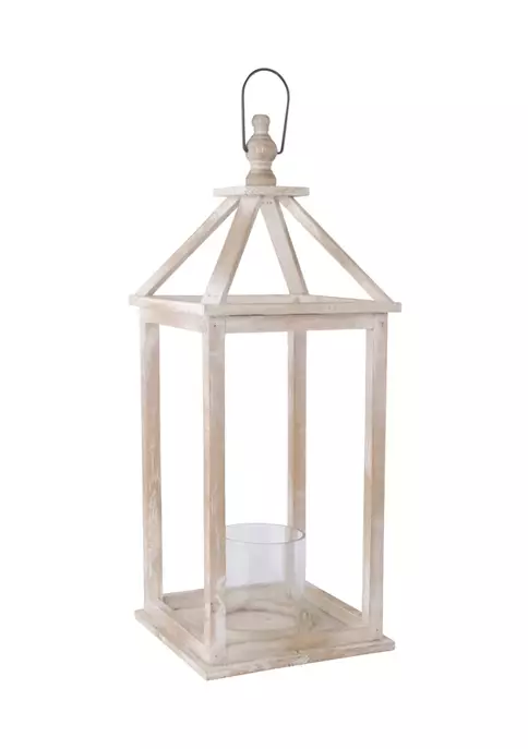 Rustic white-washed wood makes this small lantern from Bazaar a perfect addition to your mantle, table, or bookshelf.