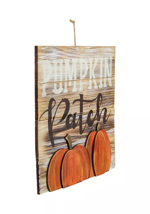 Welcome Fall with this Pumpkin Patch Wooden Sign. It features layered wood pumpkins complete with the phrase “Pumpkin Patch”. This sign is the perfect addition for Fall Halloween and Thanksgiving decorating
