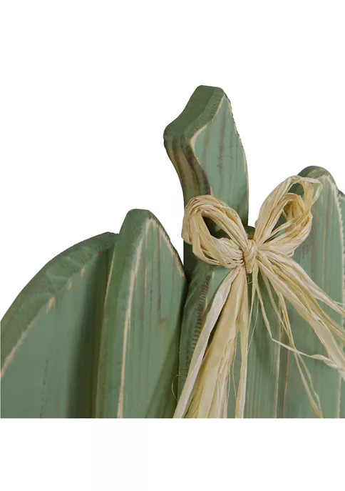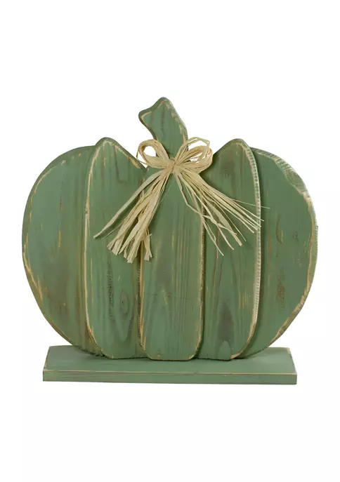 Rustic green wooden pumpkin will add a unique pop of color to your fall decor. Distressed finish pumpkin sits atop a wood base. Perfect tabletop or mantlepiece for your kitchen or dining areas and window displays!