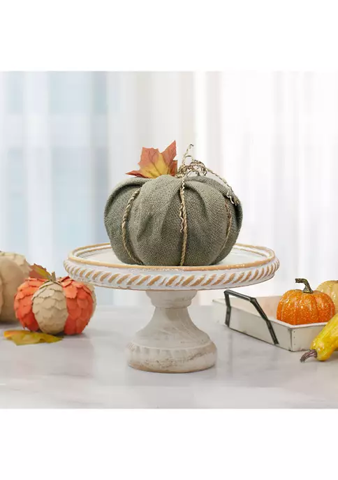 The perfect table top or mantle piece to add an autumn touch to your holiday decor. This pumpkin is free standing and has a folded burlap design. The neutral gray tone will compliment any country rustic setting.