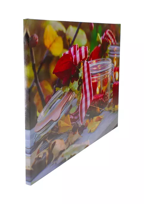 There’s nothing better than a crisp autumn morning filled with gorgeous color changing leaves. This beautiful wall art depicts a glass jar filled with a candle and berries surrounded by fall leaves and a buffalo plaid ribbon. The jar candle features a flickering orange light. Place some batteries in the back and watch it come to life. Perfect to place on any wall in your home.