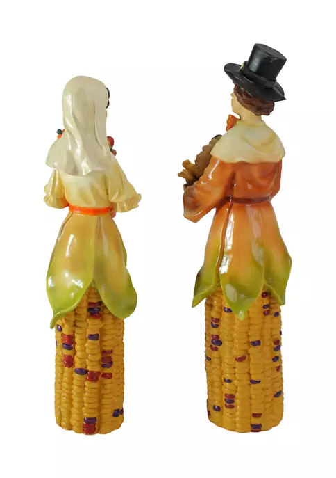 Feature a male and a female holding bountiful baskets of food with corn cob bodies